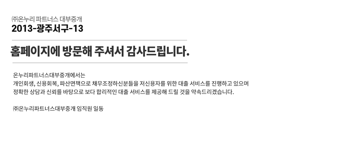 대부중개업등록번호 : 2013-광주서구-13 / 대부업등록번호 : 22-광주서구-0009 /