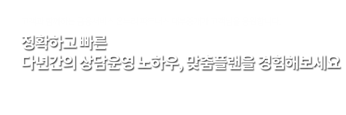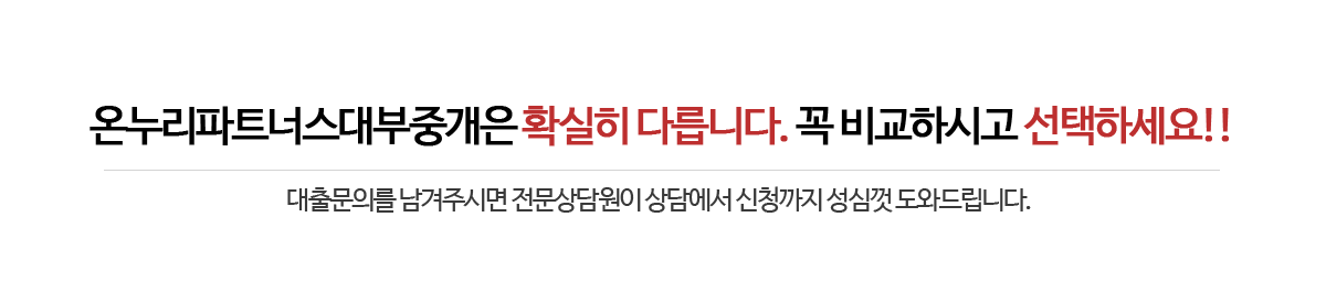 상호명 : ㈜온누리파트너스대부/대부중개 / 대표 : 김영민 / 개인정보관리책임자 : 김영민 / 사업자번호 : 410-86-74080 / 대표전화 : 1644-0396